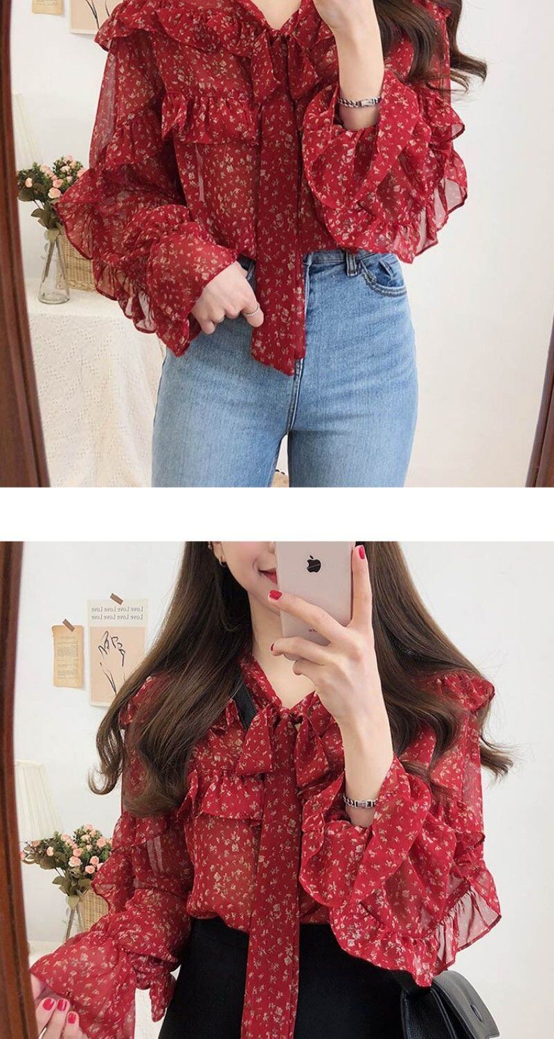 Blusa トップ長袖春花シャツ女性赤シフォンブラウススリムレースアップ弓シャツオフィスレディ ロング レッド リボン スプリング 春物 花柄 会社 学校 通勤や通学にも asa96897312933