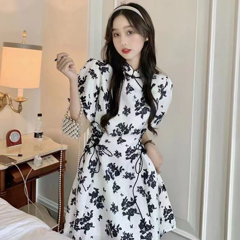 女の子チャイナドレスフランスのレトロな甘いヒップバッグショート黒花ドレス女性ミニスリーブローブセクシーな Vestidos ボディコン ブラック 大人ガーリー スウィート キュート カジュアル 花柄 asa90837392231