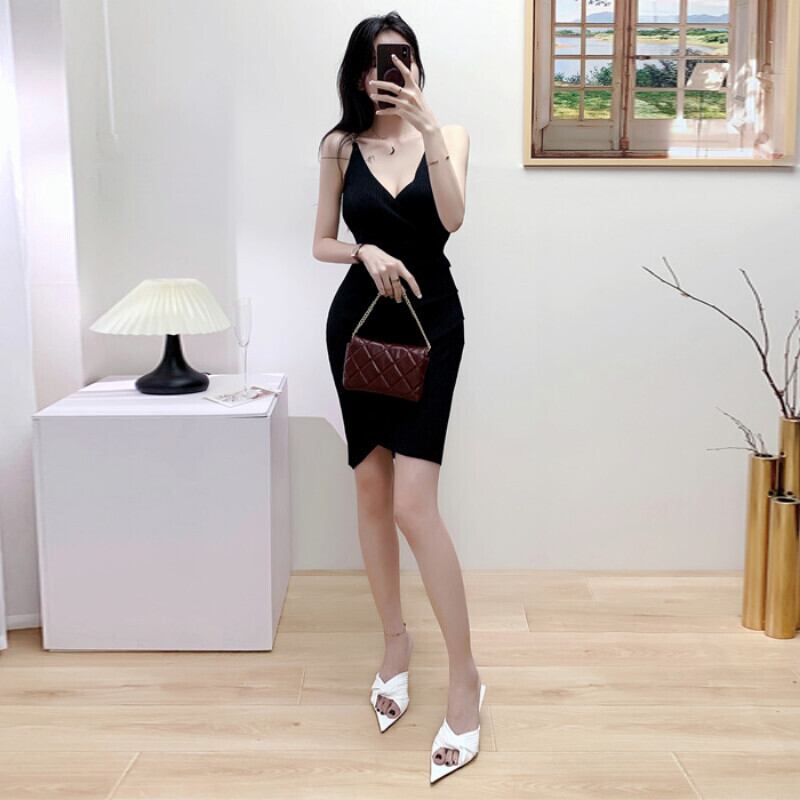セクシーなラップヒップ背中の開いたスパゲッティストラップドレス女性 V ネックワイルドソリッドミニドレス春黒ニットドレス Vestidos ブラック スプリング 春物 Vネック ソリッドカラー asa81855276760