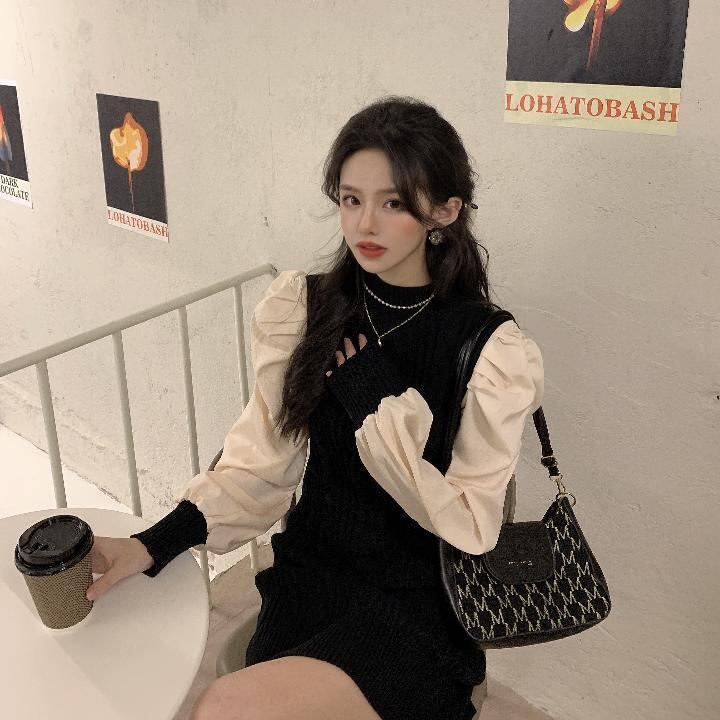 スリーブラップヒップスリムボディコンハーフカラードレス女性ウエストパッチワークパフセクシーなローブ Vestidos 黒ニットドレス ブラック スリムヒップ asa42431393889