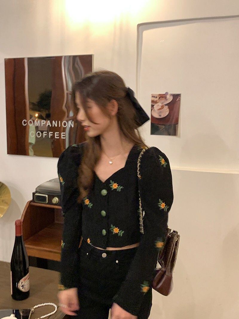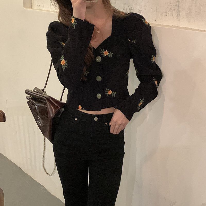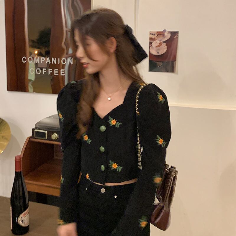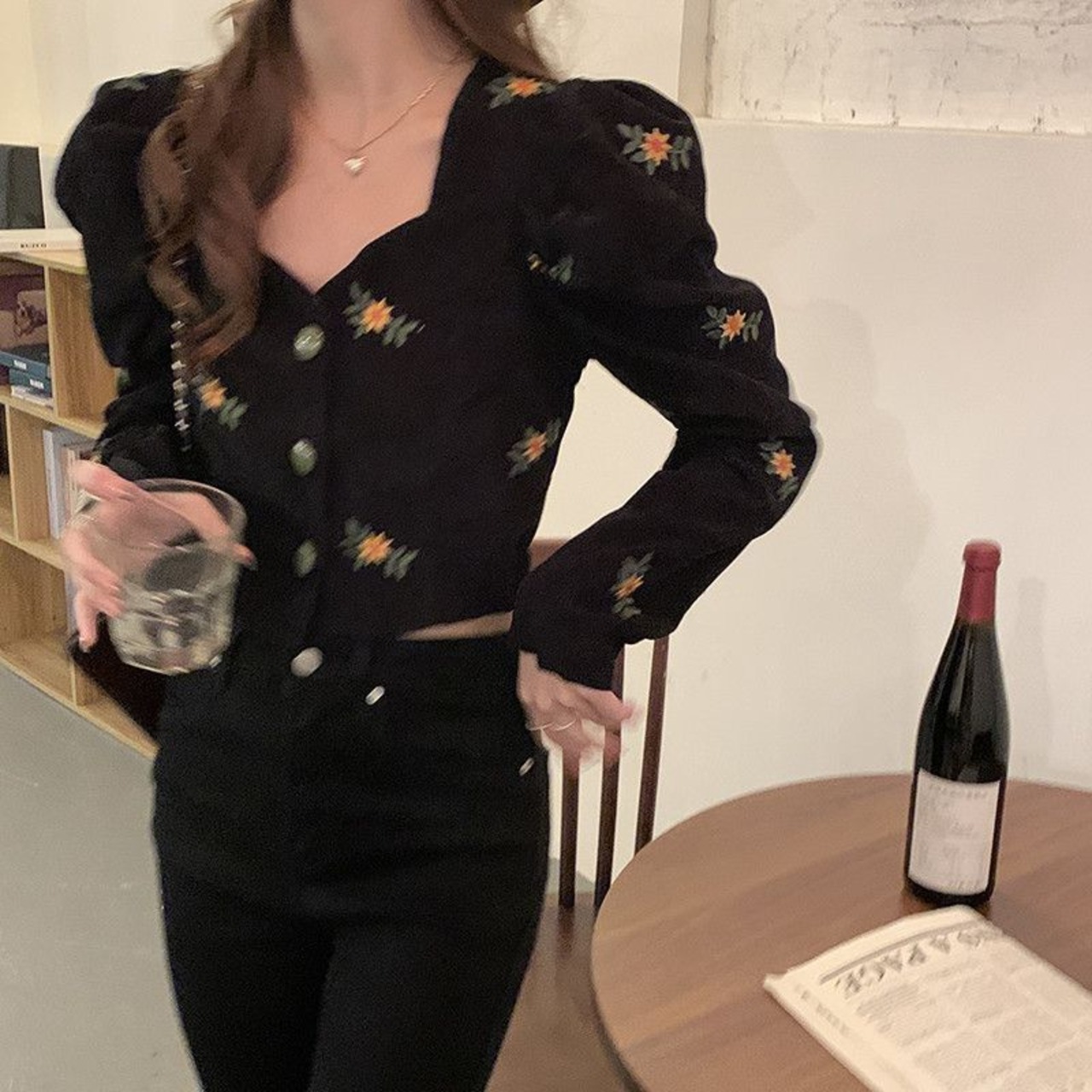 パフスリーブシックなショートトップス長袖シャツ黒花柄刺繍シャツ女性プリント春ブラウス ロング レッド ブラック スプリング 春物 asa7796970522