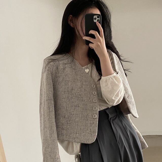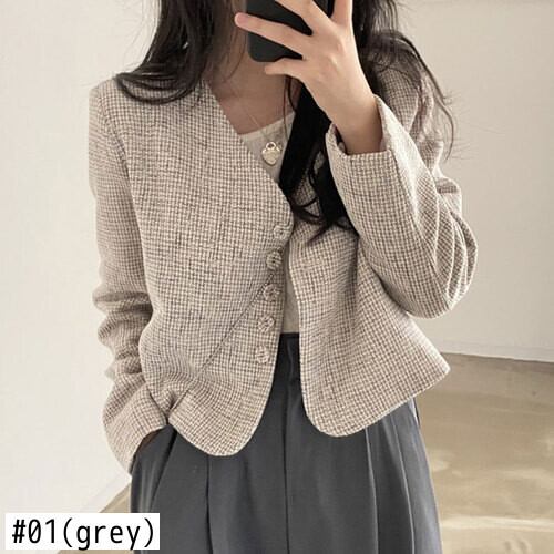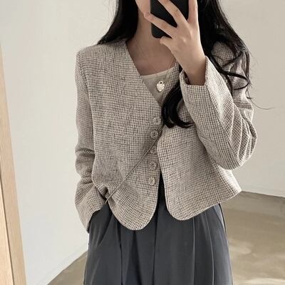 気質 スリム レトロ シンプル Vネック シングルブレスト チェック柄 ジャケット ショート ロングスリーブ ツイード カーディガン 薄手 秋 トップス 長袖 オータム 秋物 asa37514465657