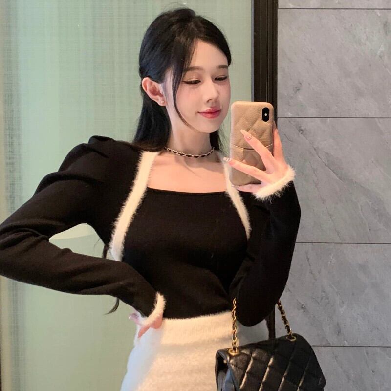 ジャンパーセータークロップドブラックセーター女性パフスリーブスリムプルオーバーショートスクエアセータートップニットウェア春 スプリング 春物 スクウェア asa54347495083