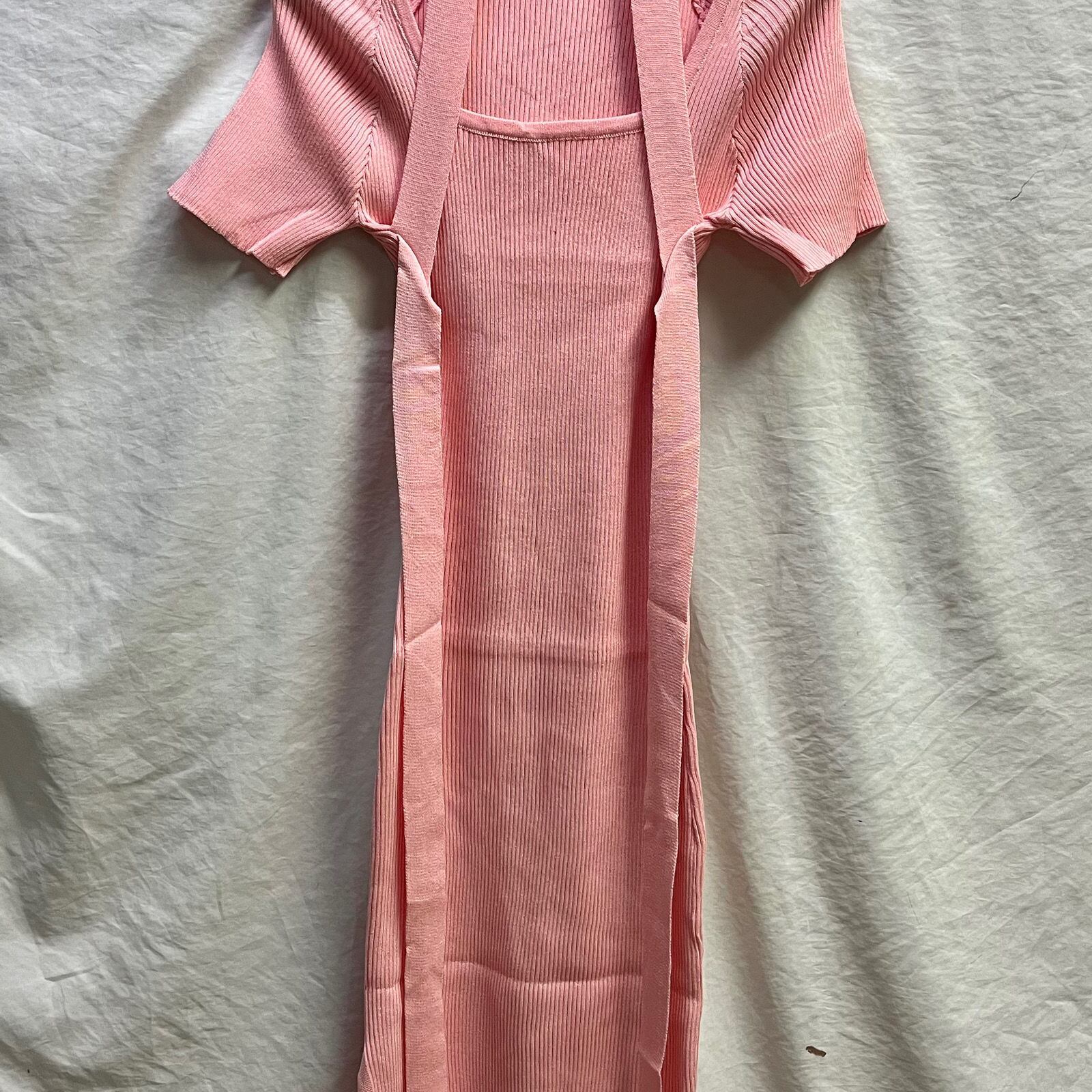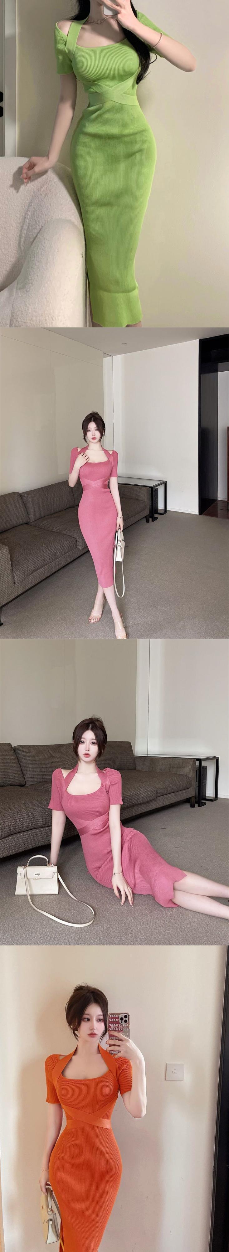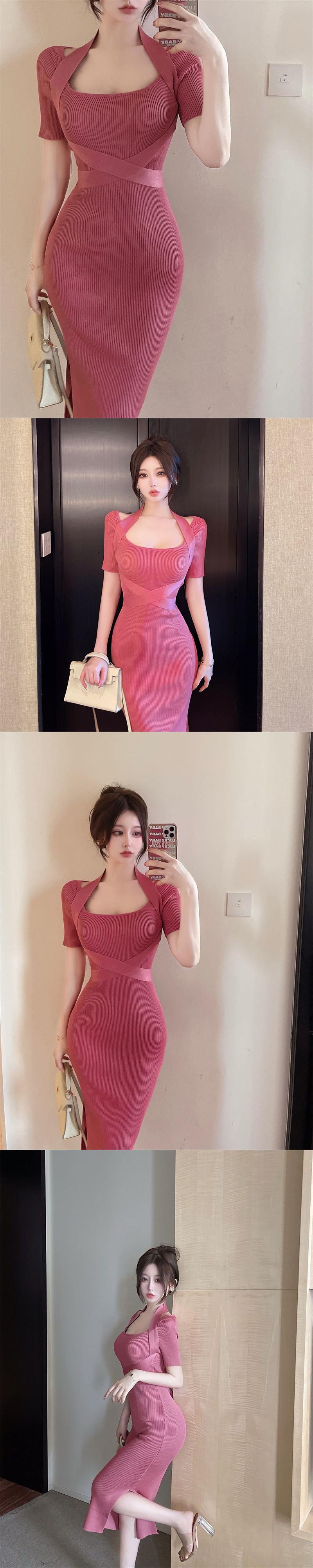 Vestido ローブセクシーなスクエアピンク半袖セータードレス女性ラップヒップ春ホルターニット固体女性ドレス ショート ハーフスリーブ スプリング 春物 ソリッドカラー スクウェア asa30532824672
