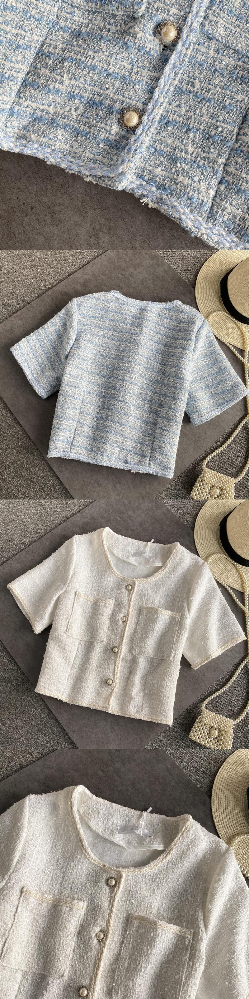 夏の気質クルー半袖ツイードジャケット女性チェック柄オフィスレディスリムボタンポケットクロップトップス ショート ハーフスリーブ サマー 夏物 会社 学校 通勤や通学にも asa20868330308
