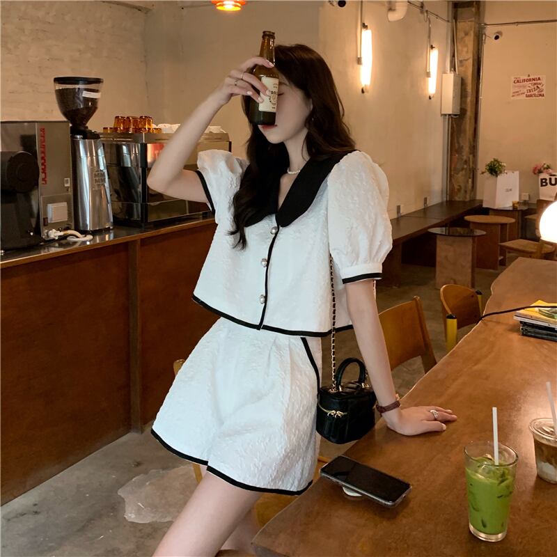 フレンチパフ半袖トップジャガードショーツセットクロップホワイトブラウスワイドレッグシャツ 2 点セット女性春 ショート ハーフスリーブ スプリング 春物 ブルマー ワイドパンツ asa94768112617