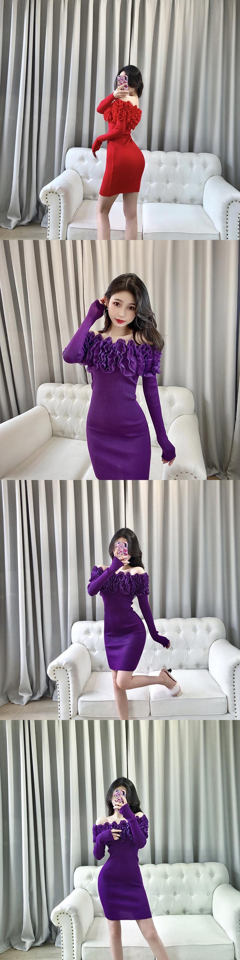 ワイルドソリッド3Dフラワージャカードセクシーフルスラッシュネックニットドレスミニラップヒップスリムオフショルダーローブレディセーター秋 スリムヒップ ソリッドカラー フラワーデザイン asa70764119576
