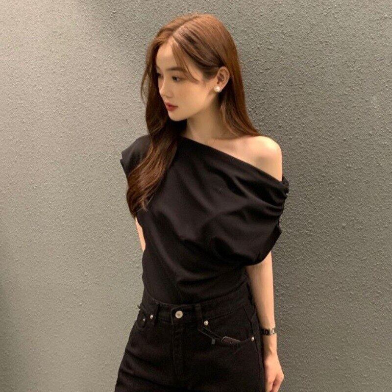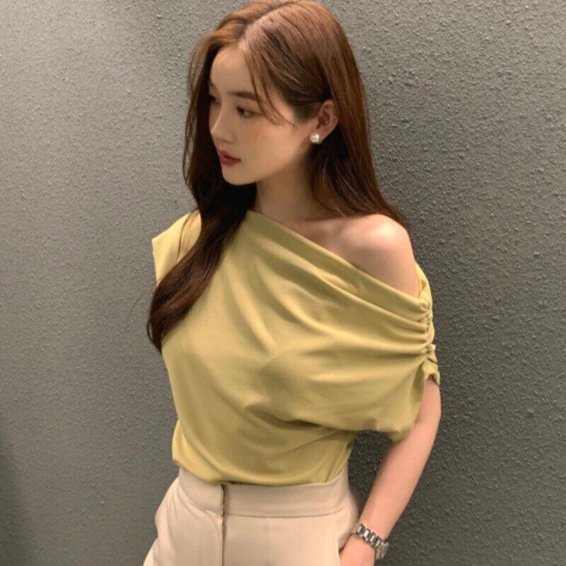 OL フレンチシックな斜め襟 Tシャツスリムクロップトップス無地ベーシック Tシャツスラッシュオフショルダーコットン半袖 Tシャツ女性 ショート ハーフスリーブ ソリッドカラー asa62271010350