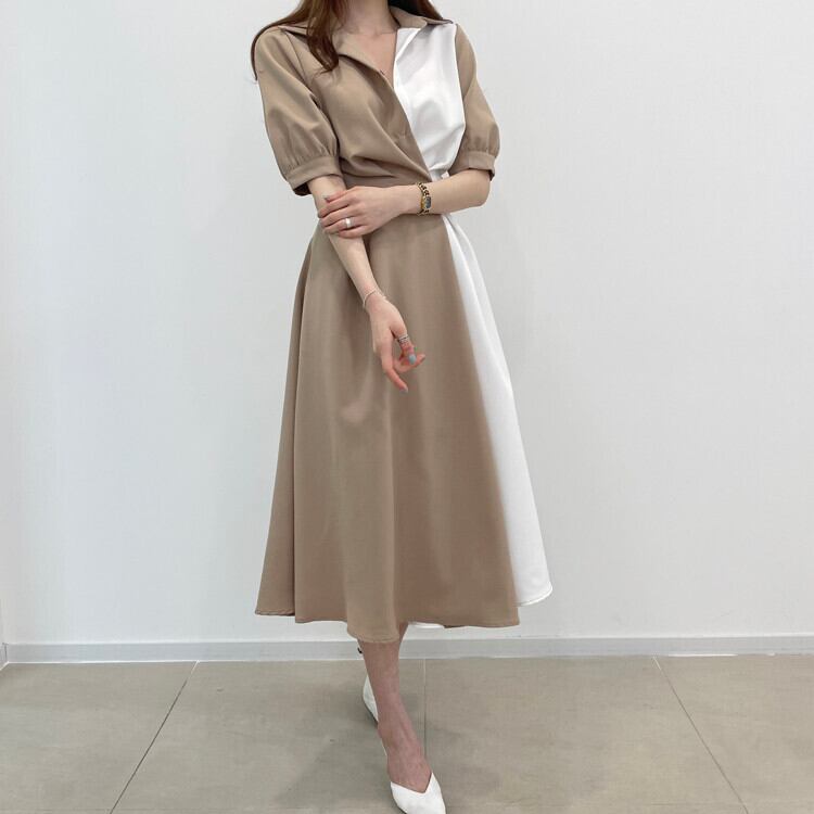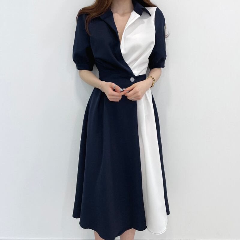 ラペルコントラストシングルボタン半袖ドレス女性シャツサマードレス A ラインウエストレトロ Vestidos デ ショート ハーフスリーブ 夏物 Aライン asa53465561700