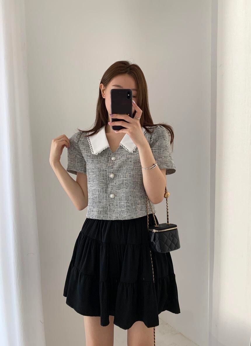 ラペルシングルブレストトップチェック柄シャツ女性半袖ブラウスクロップウエストふくらん黒ケーキスカートショートシャツ ブラック ハーフスリーブ asa85351976069