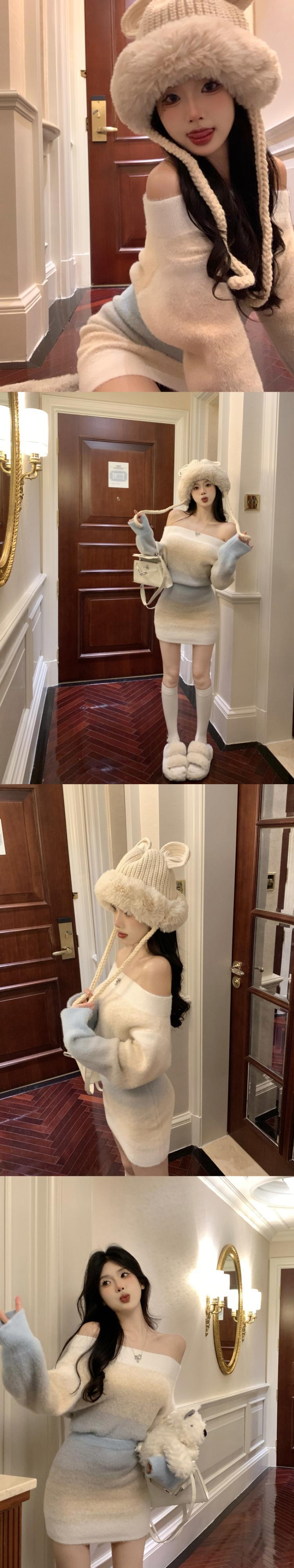 2点セット レディース 衣装 グラデーション オフショルダー 長袖 ショートセーター ニットウェア トップス ミニスカート ヒップ ロング asa2007774853
