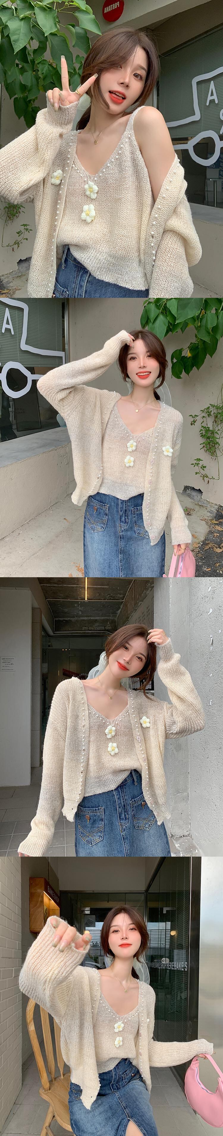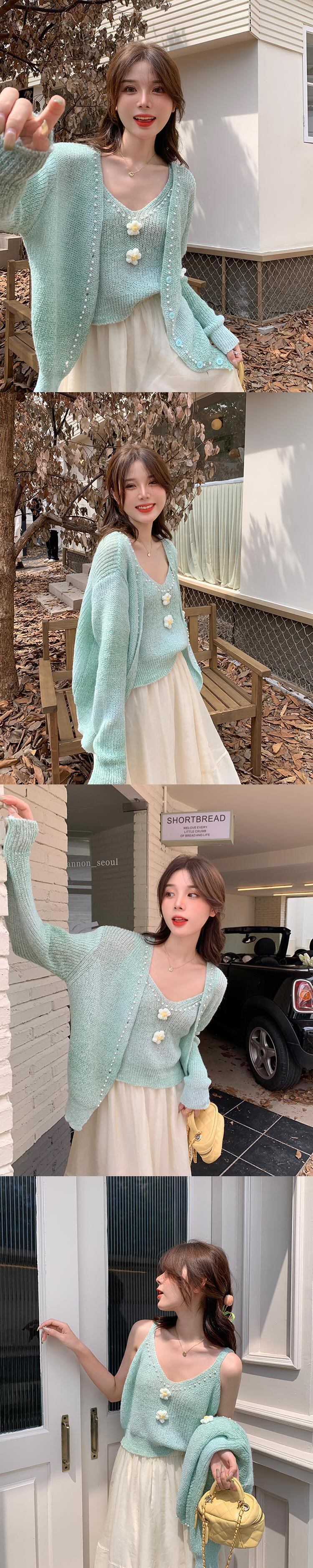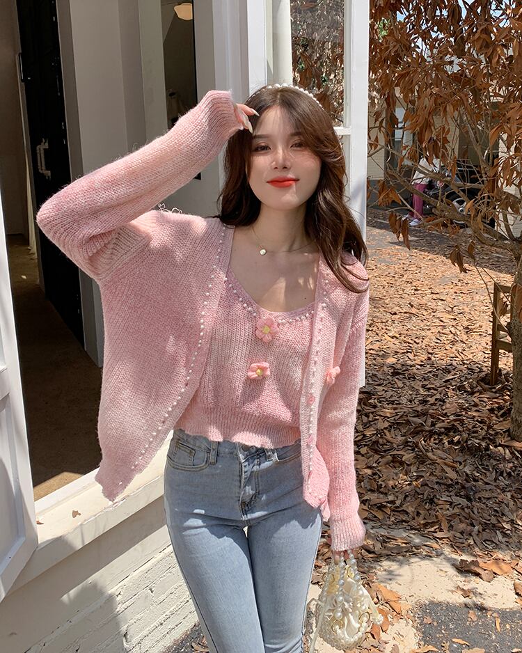甘い優しい春グラデーション キャミソール トップス 3D フラワー カーディガン クロップド セーター 2 点セット ニット スリム 大人ガーリー スウィート キュート カジュアル スプリング 春物 フラワーデザイン asa56206198119