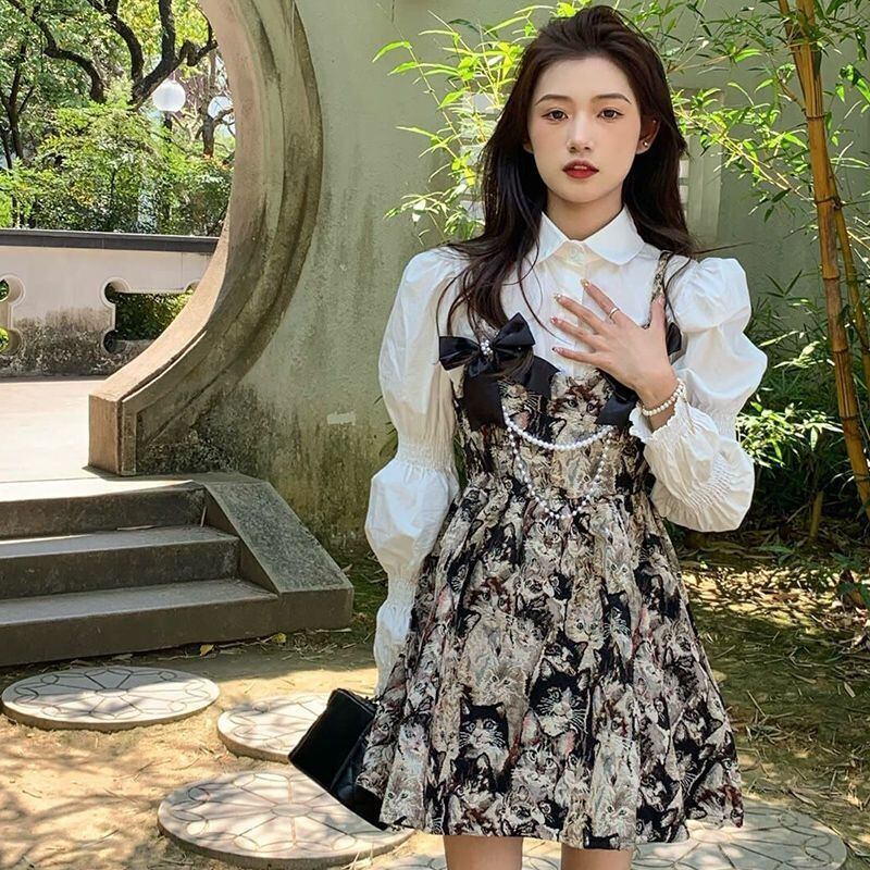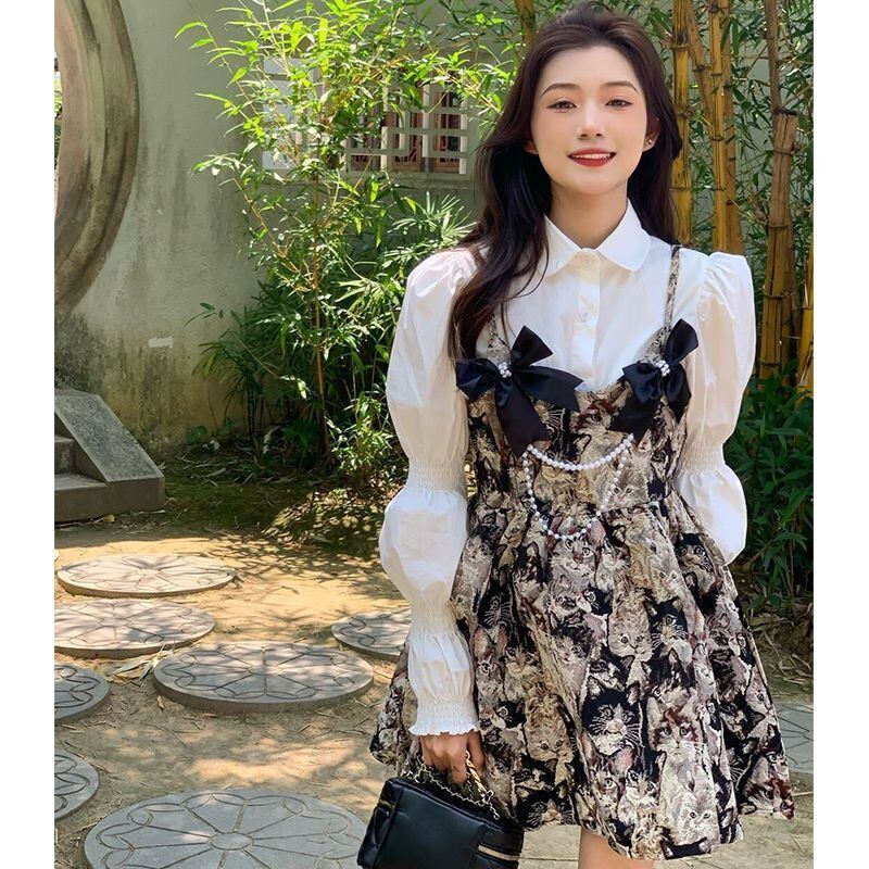 長袖白シャツ女性トップストラップ油絵猫ドレスミニレディース 2 peice セットブラウス弓秋 ロング ホワイト リボン オータム 秋物 asa65212173770