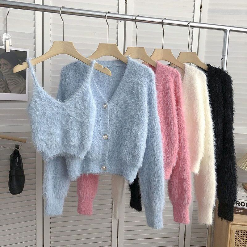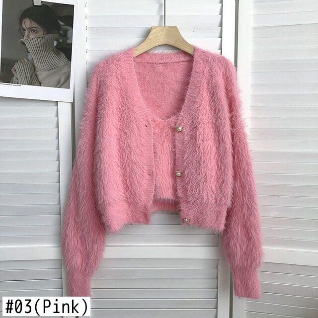 ミンク カシミヤ キャミソール トップス フリース ショート ピンク カーディガン ニット コート プル セーター ホワイト セーター レディース 2セット asa74547434910