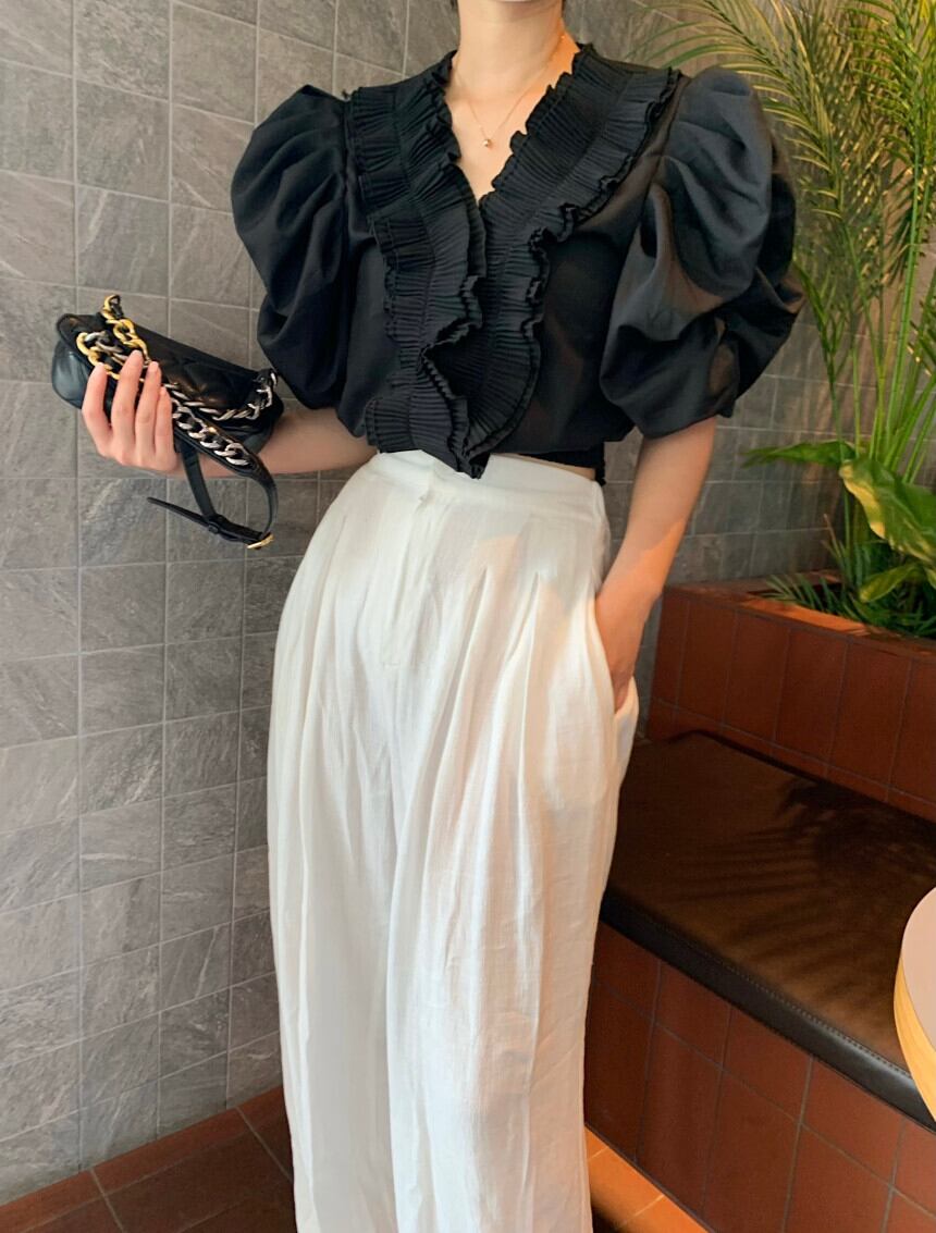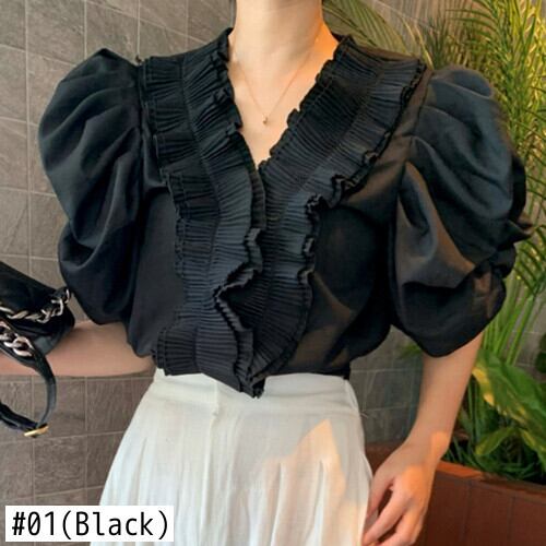 宮殿スタイル V フリルルーズバブル半袖黒シャツ女性 Y2k トップス夏ブラウスシャツ ショート ブラック レース ハーフスリーブ サマー 夏物 asa995889746