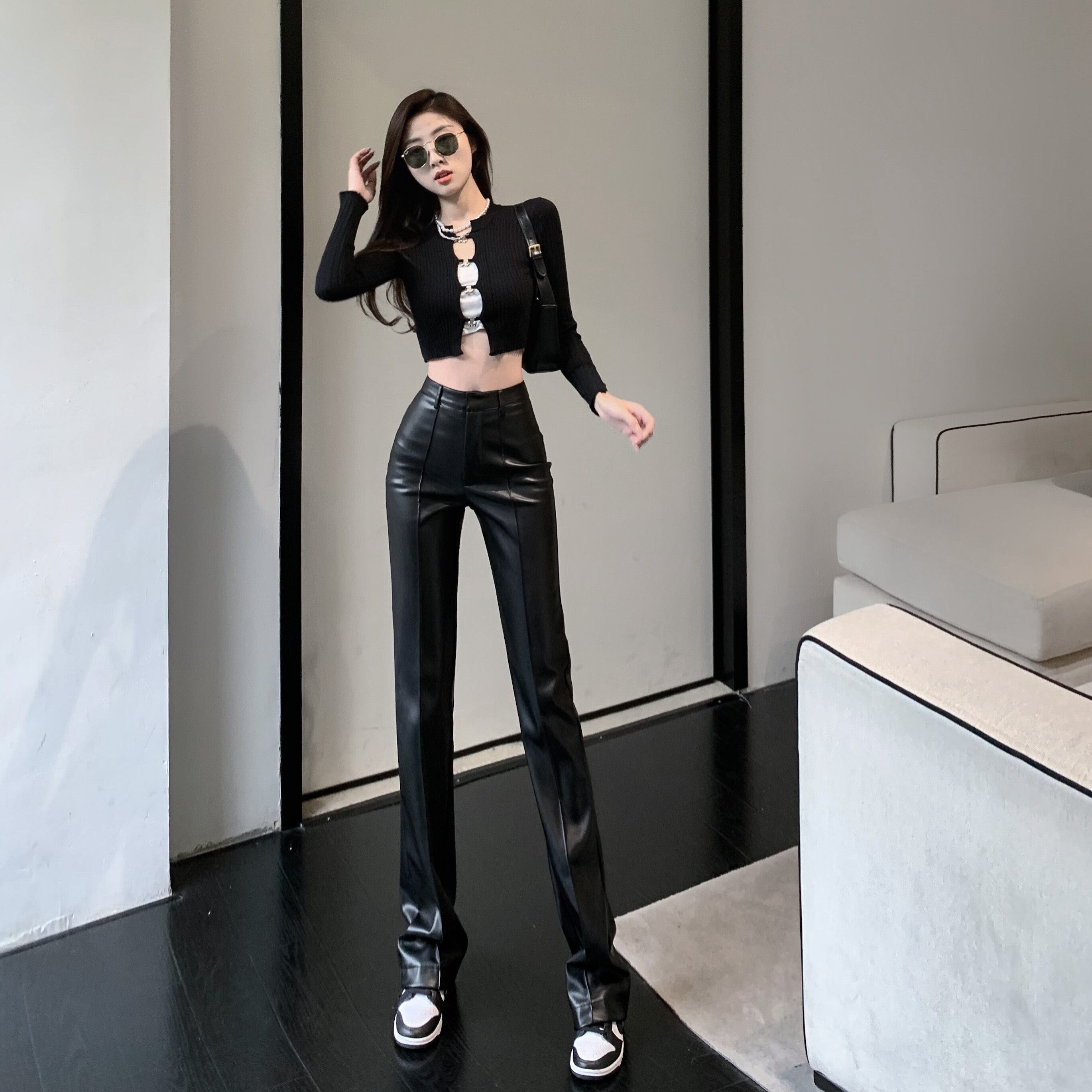 ウエストストレートタイトな黒革のパンツ女性ワイド脚春スリムストリート PU ズボンカーゴ Pantalones ブラック スプリング 春物 レザー ワイドレッグ ワイドパンツ asa68155816392