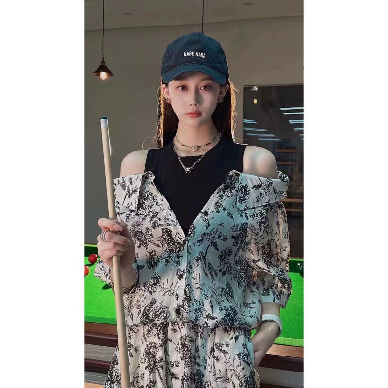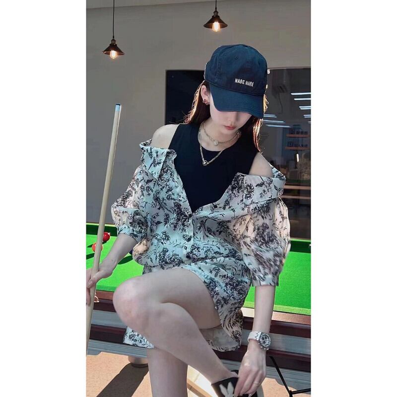 セクシーなオフショルダーインクシャツ花柄シャツ女性レトロスリムクロップトップスワイド脚ショートセット春 2 点セットビーチブラウス スプリング 春物 ワイドレッグ ワイドパンツ asa35779152632