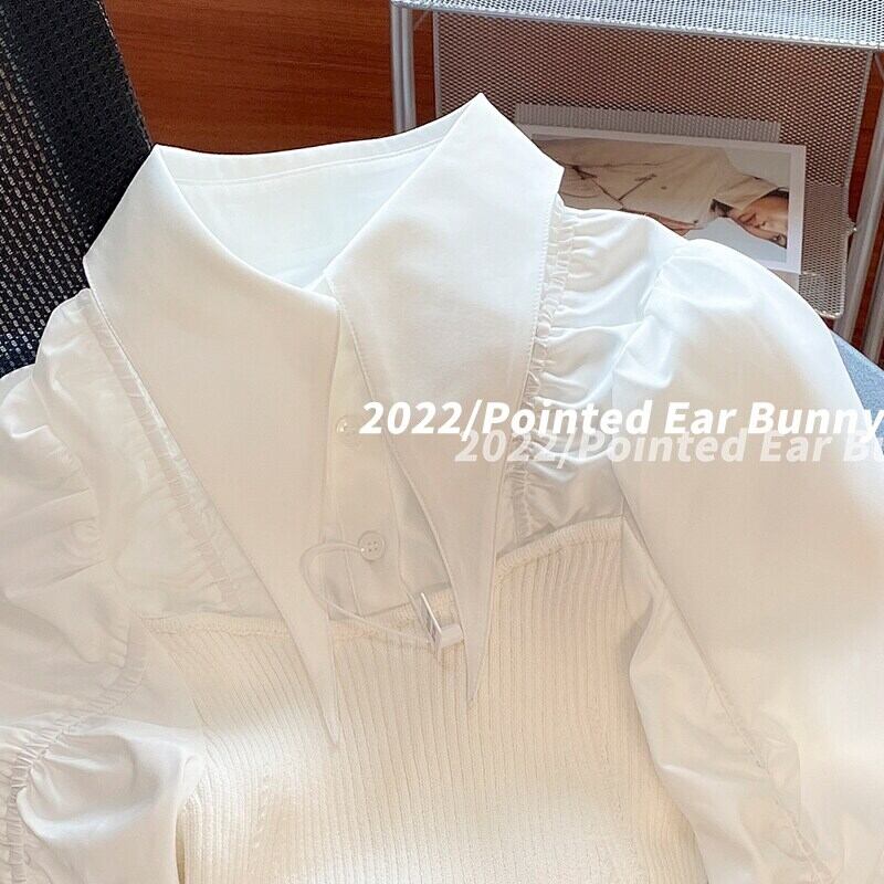 フェイクツーピースクロップトップスリムプリーツスリーブブラウスレディOLシャツ白シャツ女性春スリムニット ホワイト スプリング 春物 asa57027695958