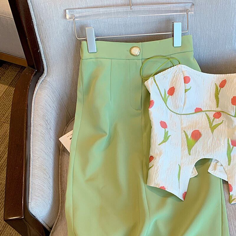 タンクトップ花柄キャミソールブラウスビーチスタイルスリム A ラインウエストグリーンスカート 2 点セットレディース衣装シャツ Aライン asa90863727495