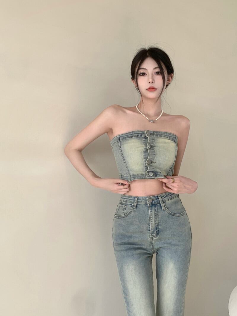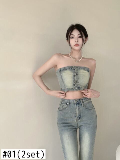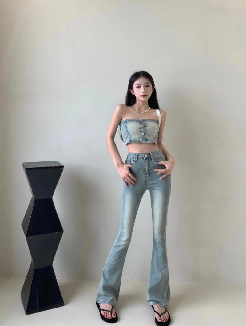 スリムセクシーなキャミソールトップデニムシャツタンクブラウスワイドレッグストレートフレアジーンズパンツセット 2 ピースセット女性 Y2k ワイドパンツ asa87733939359