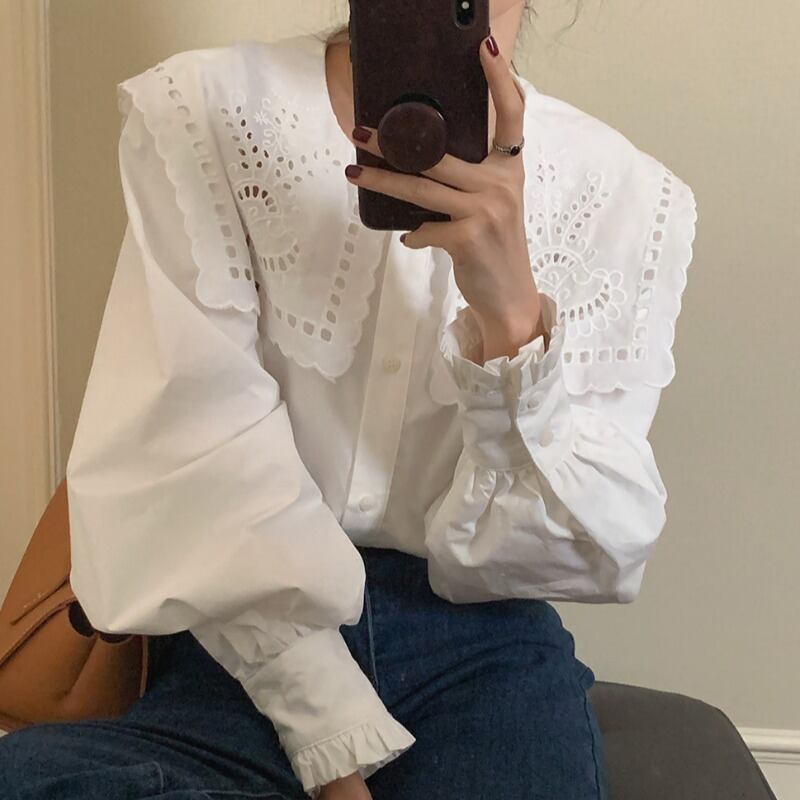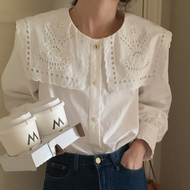 カットアウト刺繍大襟シングルブレスト白シャツ女性デモーダ春トップス OL シャツブラウス ホワイト スプリング 春物 asa34555991524