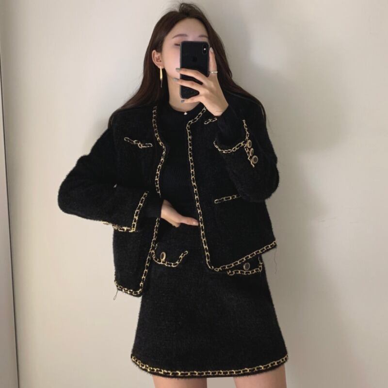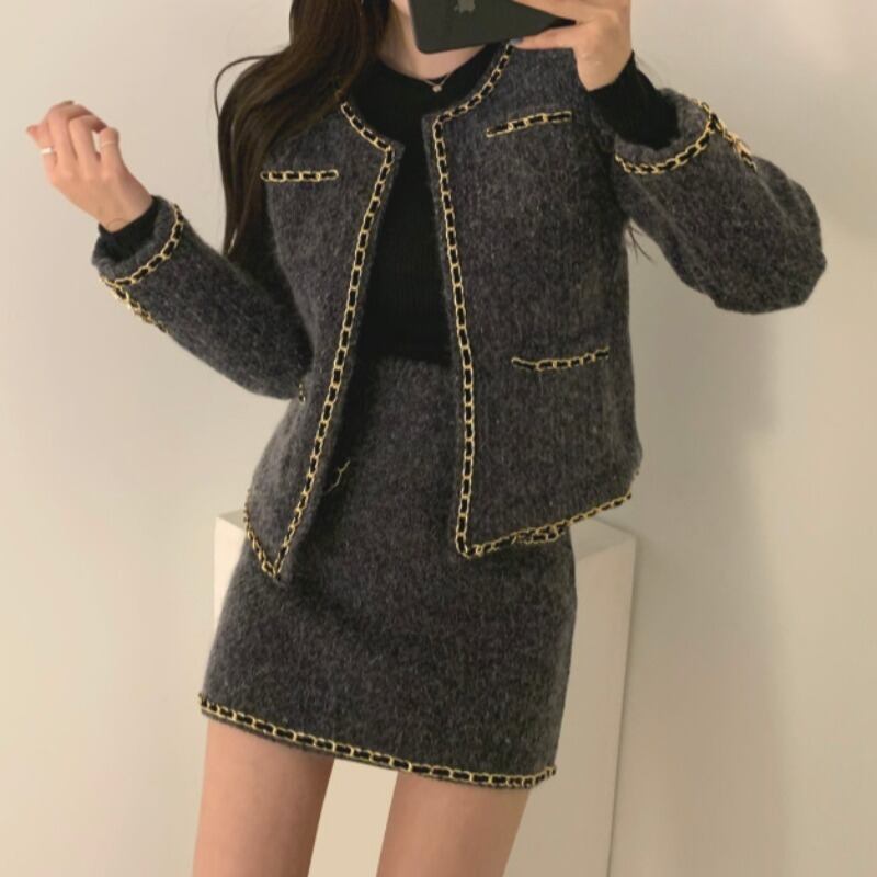 秋冬セット 気質 スリム ウエストラップ ヒップスカート ミニ Oネック 長袖 ヒットカラー ツイード ジャケット ショート ロング オータム 秋物 ウィンター 冬物 asa85472044521