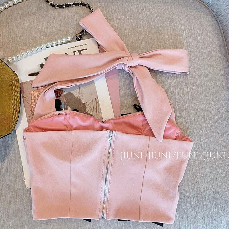 リボン ホルター トップス クロップ ピンク かぎ針編み トップ ストラップレス シャツ スウィート ブラウス かわいい Y2k タンク ジッパー シャツ シック 大人ガーリー キュート カジュアル asa8496667266