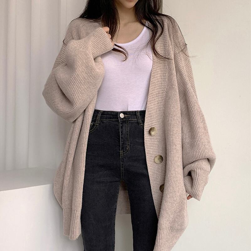 Vネック シングルブレスト ルーズ ランタン スリーブ ニット カーディガン グレー セーター コート ワイルド スタイル セーター デ ランタンスリーブ asa82953827954