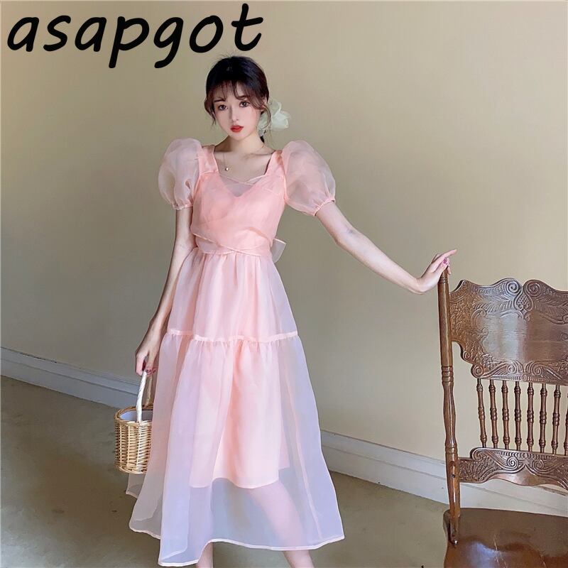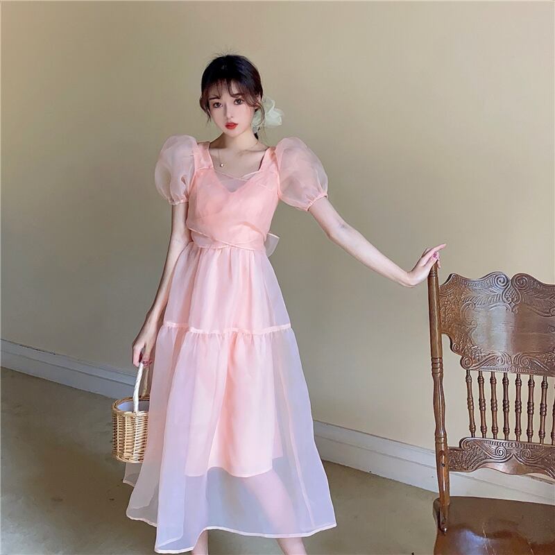 ドレス気質スウィート V ネックバックボウピンクパフ半袖メッシュドレス女性オーガンザスリムウエストスイング Vestido デ ショート リボン ハーフスリーブ 大人ガーリー キュート カジュアル Vネック asa38029225543