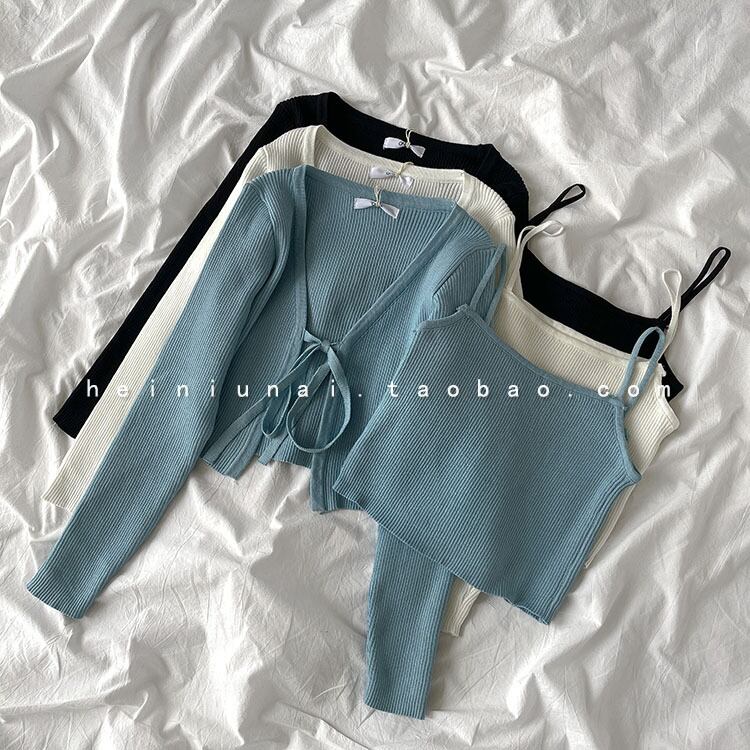 キャミソール タンクトップ バンデージ クロップド カーディガン Feminino 2 点セット ホワイト ニット セーター レディース コート 春 スプリング 春物 asa42931776054