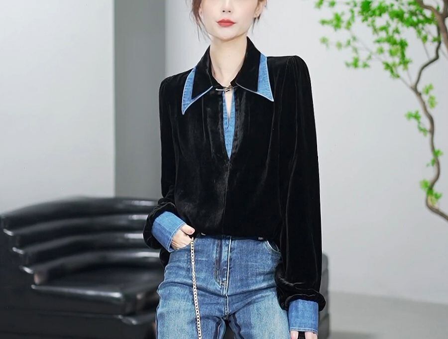 春のレトロなラペルデニムシャツ女性フェイクツーピース s OL 黒ベルベットシャツ女性パフブラウスパッチワークトップス ブラック スプリング 春物 asa8288510200