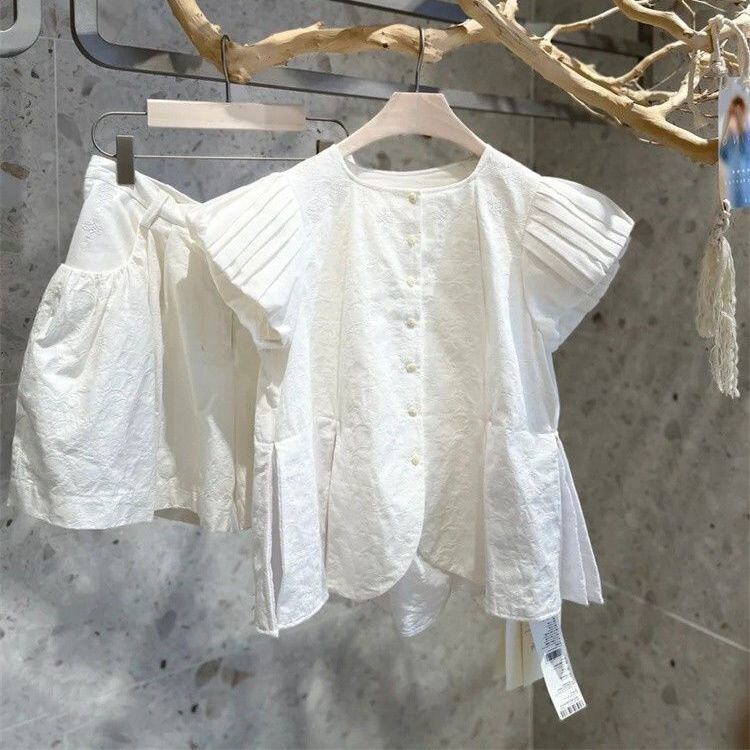 プリーツフライングスリーブシャツ女性白フリルトップ夏の女性ブラウスルースワイド脚黒ショーツセット ホワイト ブラック ラッフル サマー 夏物 ブルマー ワイドレッグ ワイドパンツ asa41991659875