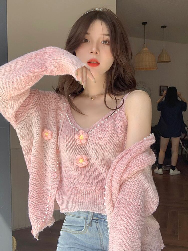 3D フラワー ニット カーディガン スリム キャミソール トップス ニット 2点セット Y2k ピンク セーター クロップド カーディガン フラワーデザイン asa92695972572