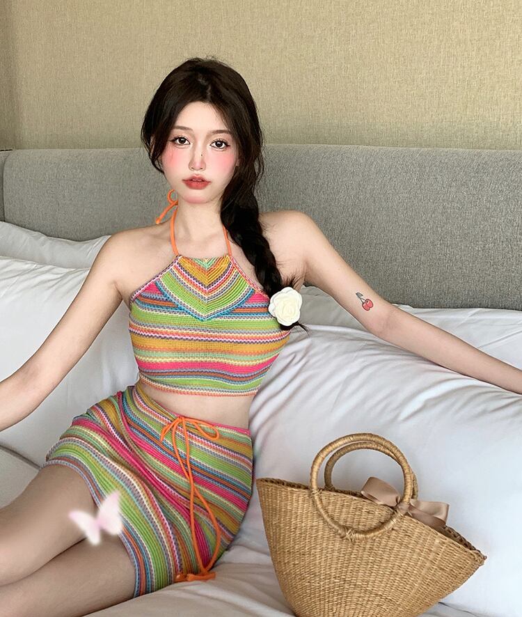 キャミソール トップス レインボー ストライプ ベスト ホルター ウエスト Aライン ニット スカート セット 春 夏 Y2k レトロ 2点セット スプリング 春物 サマー 夏物 asa78482968211