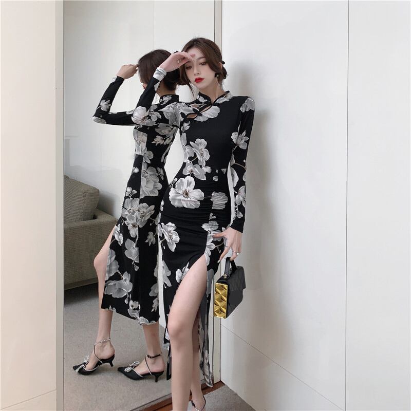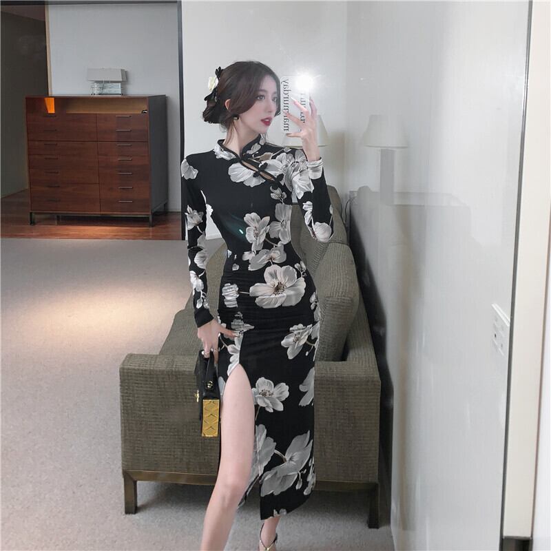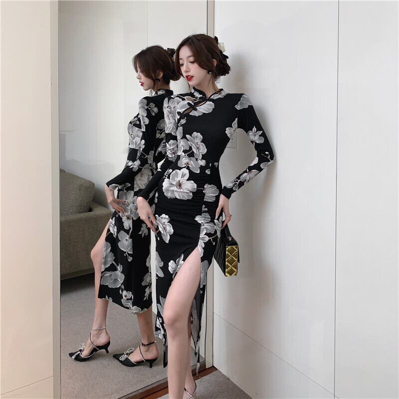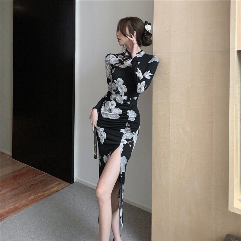 中国風のレトロな長袖スプリットブラックチャイナドレス女性春スリム Y2k ドレス Vestidos デ花柄 ロング スプリング 春物 asa36962462762