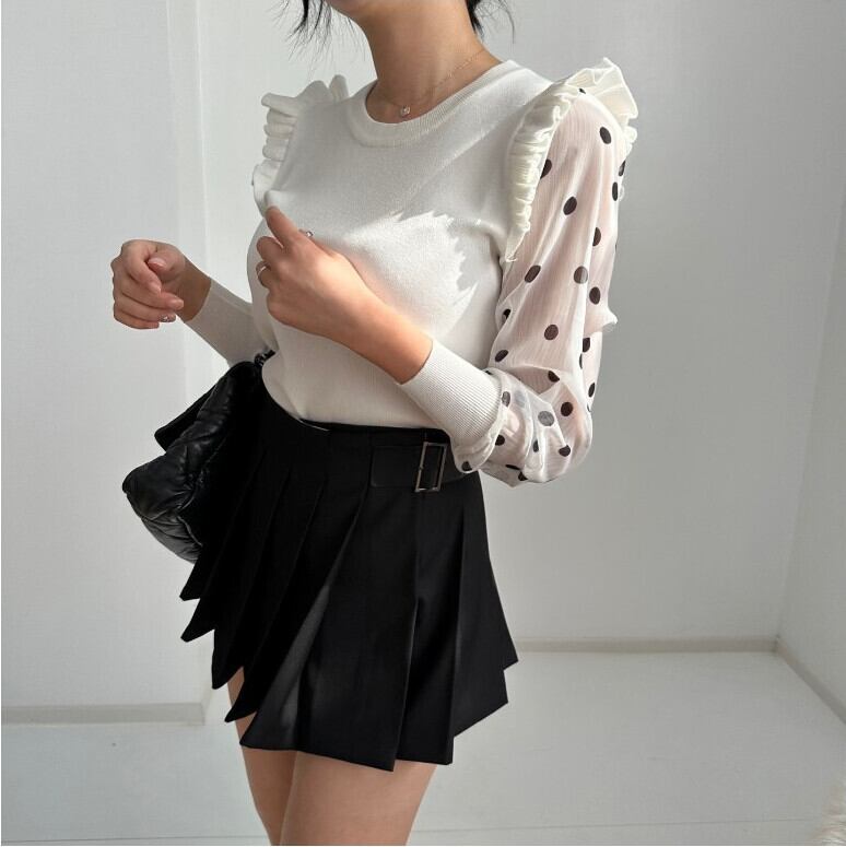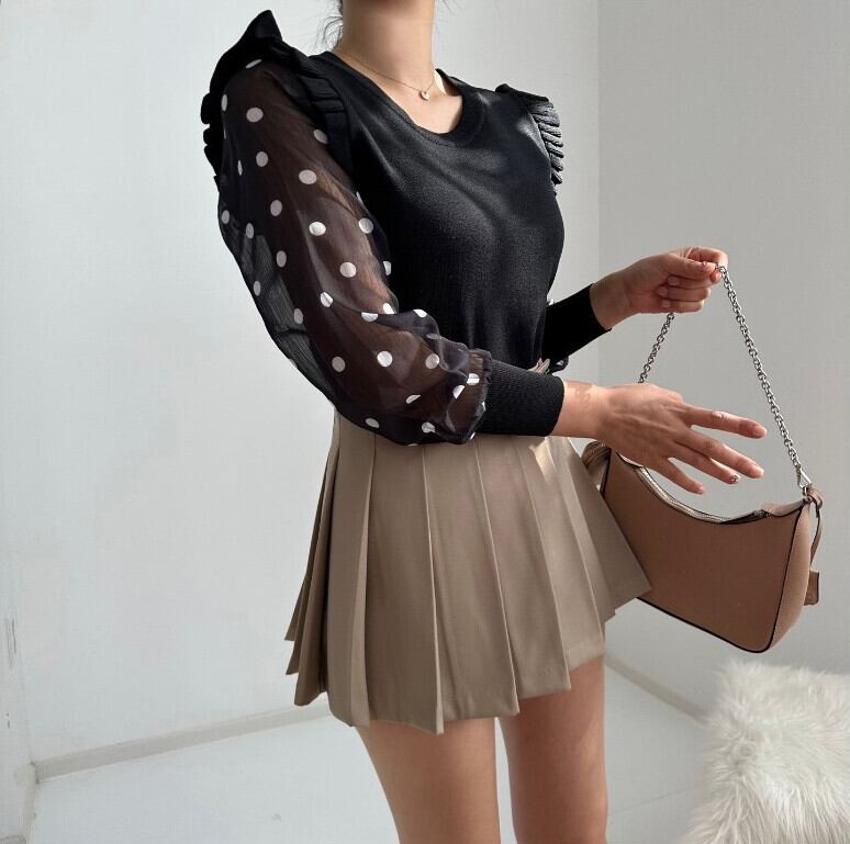 春シックなシフォンスリーブパッチワーク O ネックポルカドットセーター女性トップセーターニットセーターブラックホワイト スプリング 春物 Oネック asa5736648648
