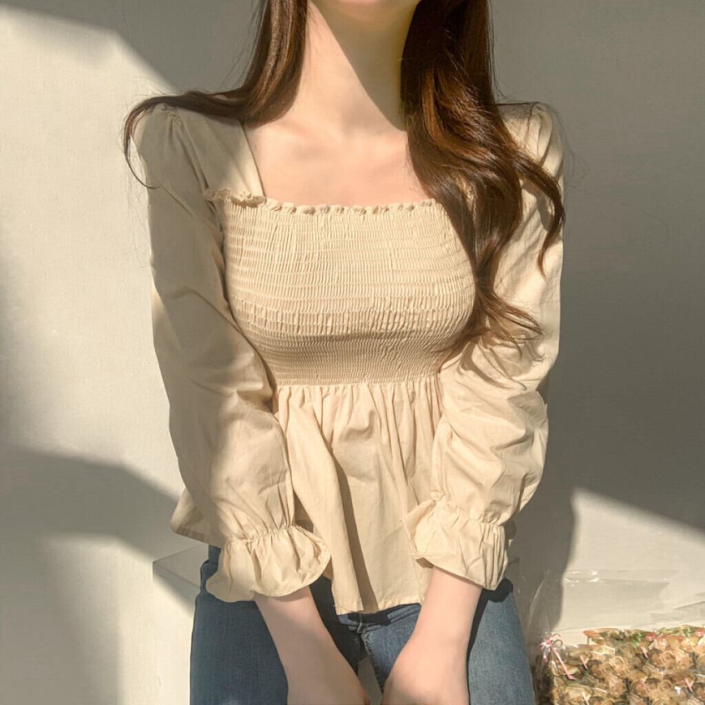 スリムスクエアクロップトップス女性白シャツウエスト倍菌長袖シャツ女性トップブラウス不規則なプリーツ裾 ロング ホワイト スクウェア asa59426697615