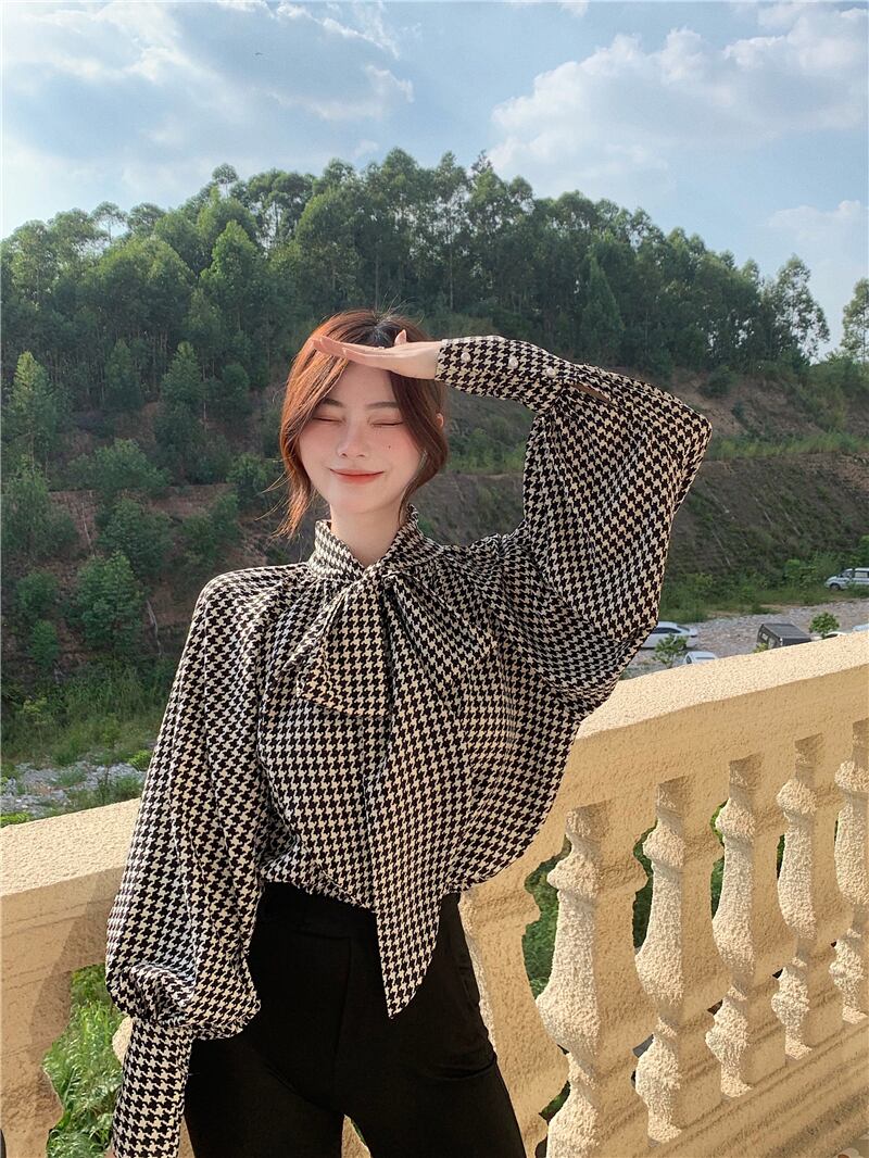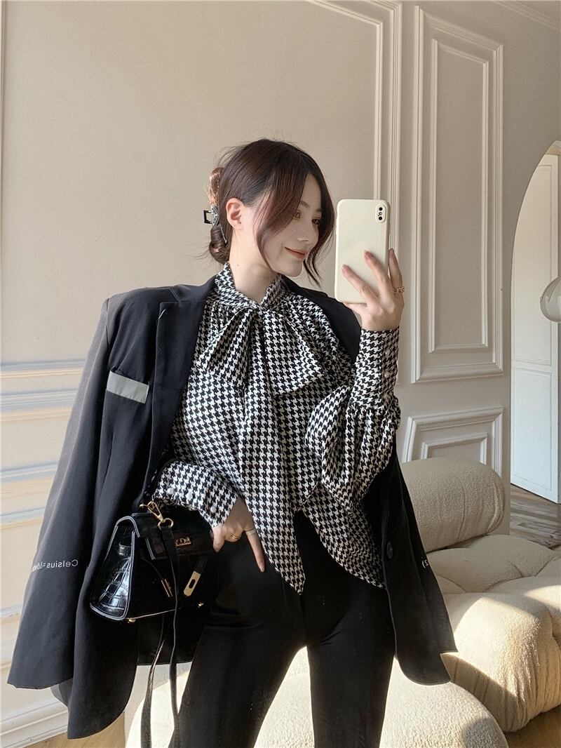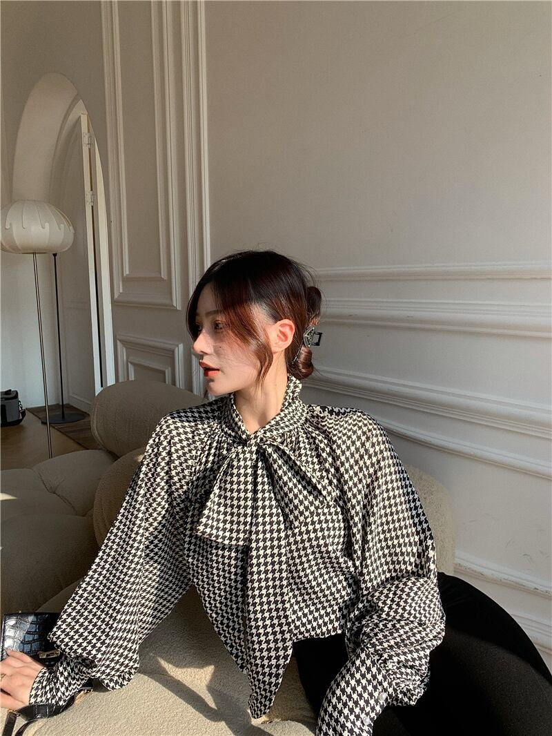 千鳥格子シャツ弓春秋のトップスリボンシャツルースブラウスデモーダ スプリング 春物 オータム 秋物