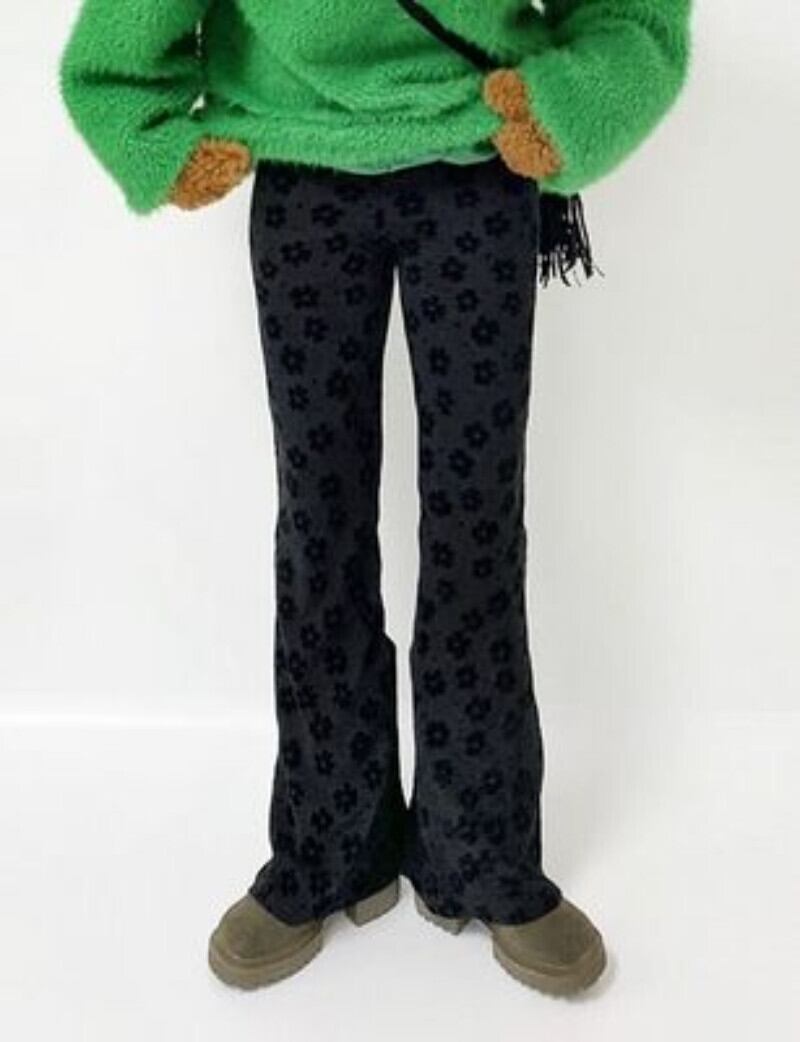 弾性ウエスト花柄黒フレアパンツ Y2k 服 Pantalones デストリートワイド脚 ブラック エラスティック 伸縮 ワイドレッグ ワイドパンツ