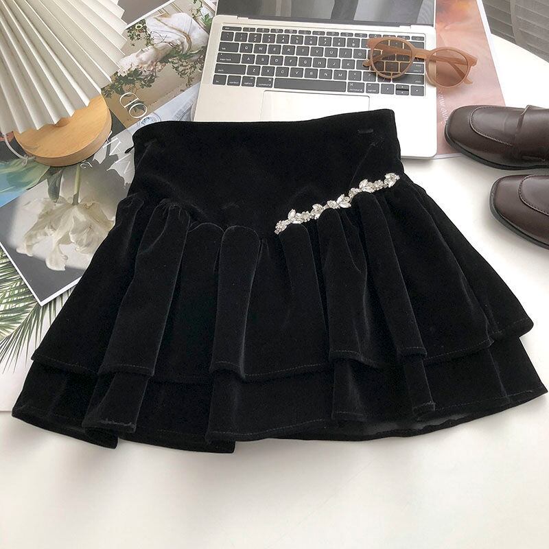 ミニ黒ケーキスカートスリムワイルドベルベットスカートワイルドショートウエスト段 Faldas モーダ ブラック
