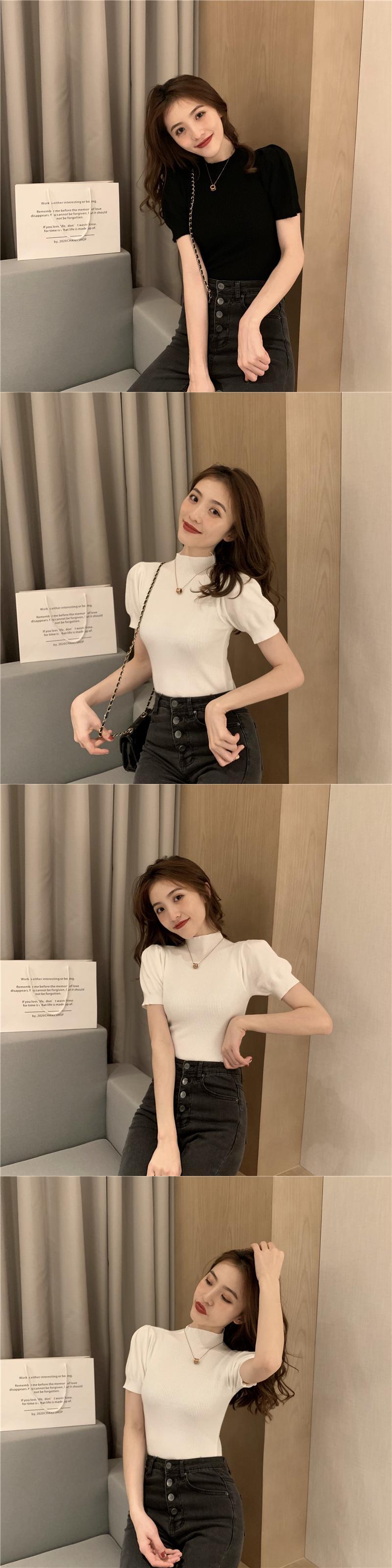 アイスパフ半袖クロップトップススリム黒 Tシャツシャツ O ネック Tシャツ Y2k Tシャツニットウェア ese スタイル ショート ブラック ハーフスリーブ Oネック シルク