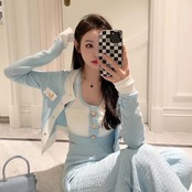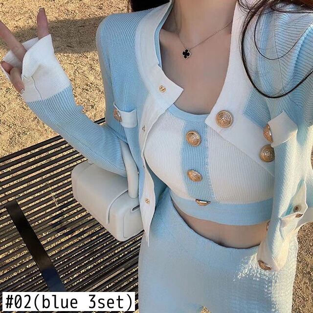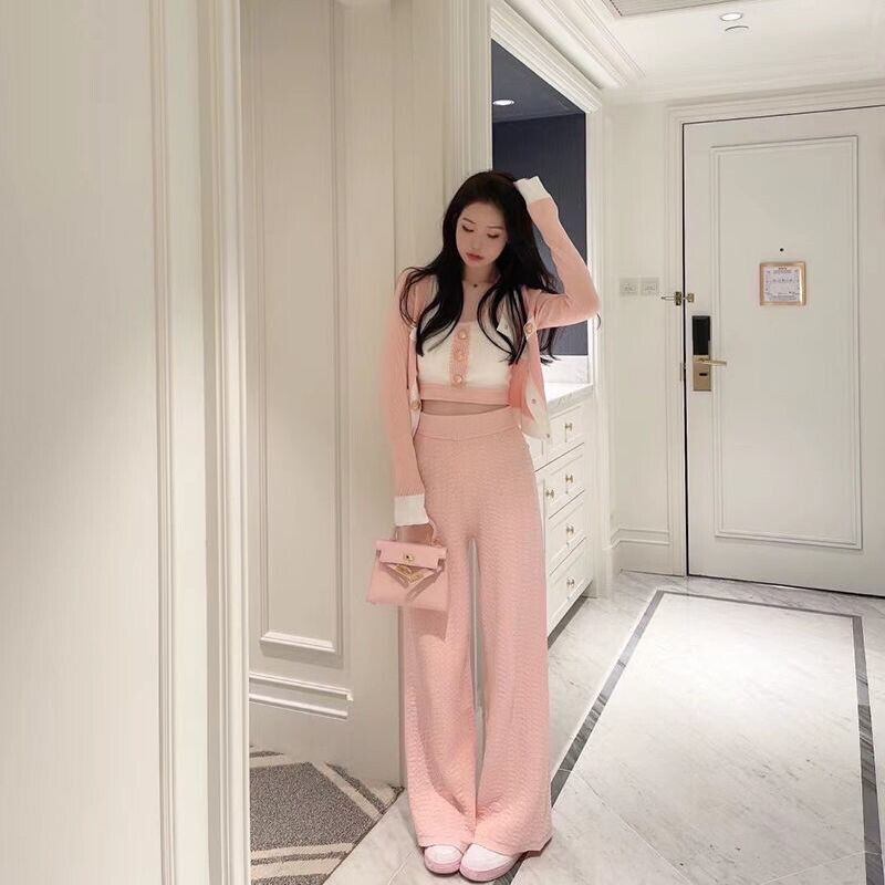 タンクトップ キャミソール 秋 ショート ブルー カーディガン アウター セーター ジャケット ワイドレッグ ニット ピンク パンツ トラックスーツ 3セット オータム 秋物 ワイドパンツ