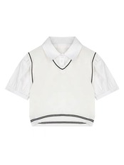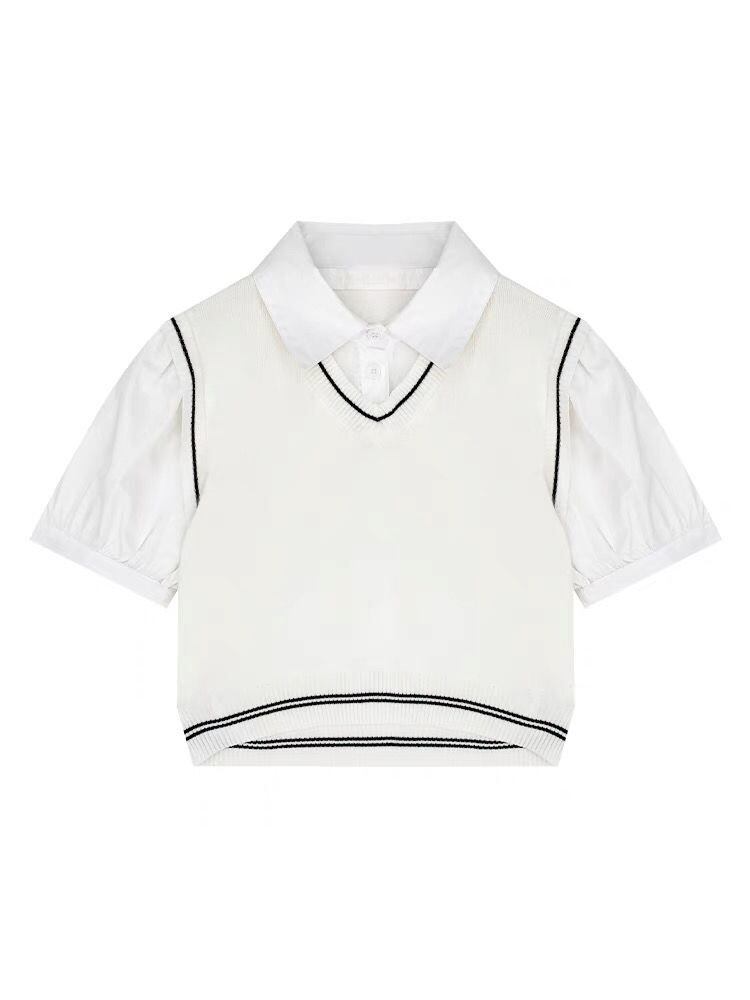 スタイルフェイクツーピースクロップトップスストライプシャツパフ半袖グラフィック Tシャツスリム Tシャツニット黒 Tシャツ Tシャツ ショート ブラック ハーフスリーブ