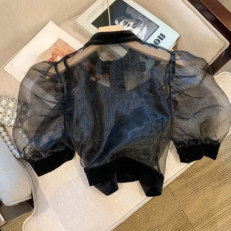 透明な黒メッシュ シャツのセクシーなクロップ トップス スリム春夏ブラウス OL レディ シャツ弓ベルベット ブラック リボン スプリング 春物 サマー 夏物