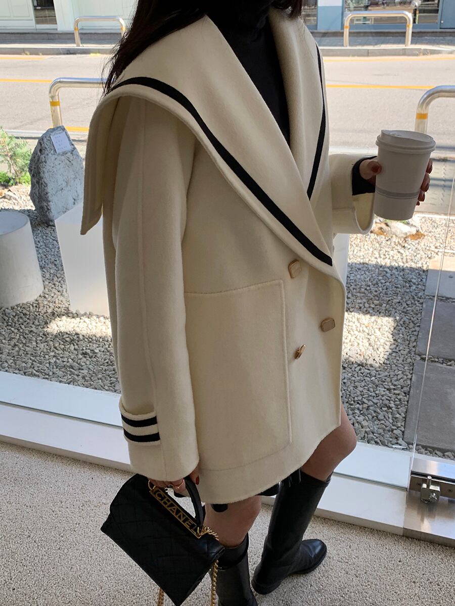 ウォームルーズラージポケットセーラーコントラストダブルブレストロングスリーブウールジャケットレディース秋冬コート 長袖 オータム 秋物 ウィンター 冬物