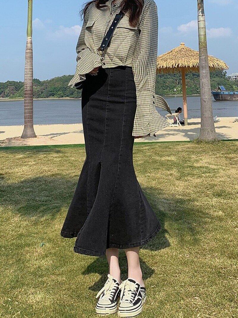 Faldas Largas 秋セクシーなスリムラップヒップ黒デニムマーメイドスカートのスプリットワイルドフリルレトロゴスストリートジーンズ ブラック オータム 秋物