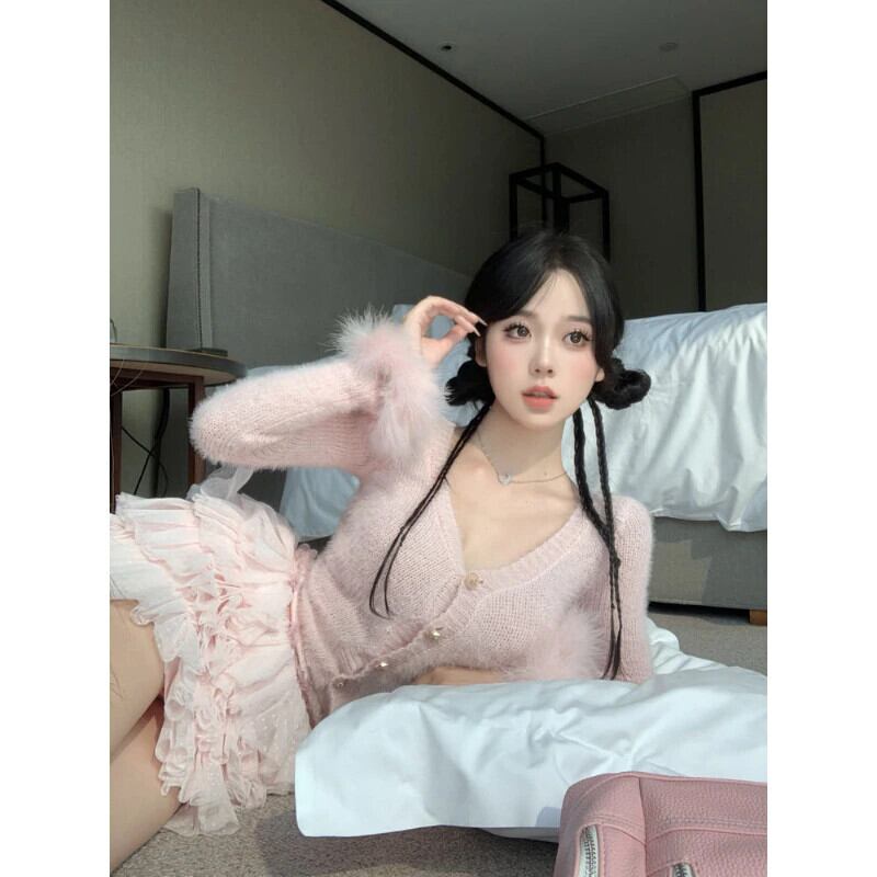 優しいスリム V ピンクの羽のセーターの Y2k 服セータークロップドカーディガンニットカーディガンシャツコートトップス