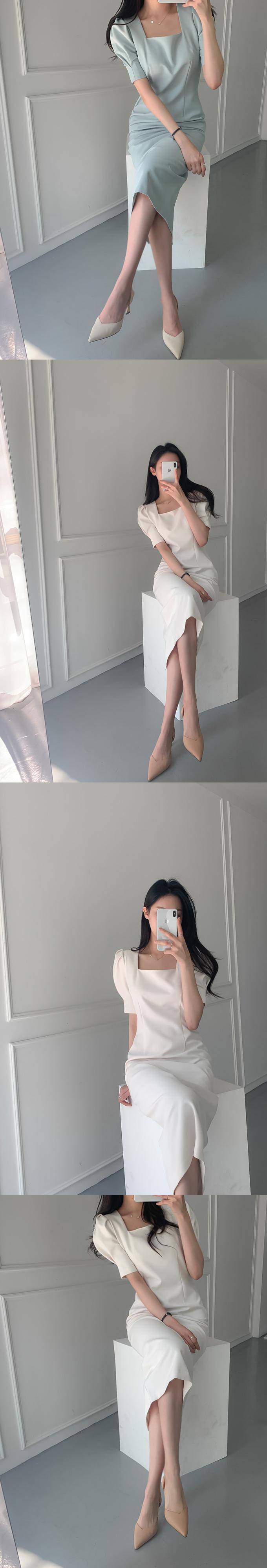Vestidos デスリムスクエアプリーツウエストロングスプリットパフヒップラップホワイトスクエア半袖ドレスオフィスレディ ショート ハーフスリーブ スクウェア 会社 学校 通勤や通学にも