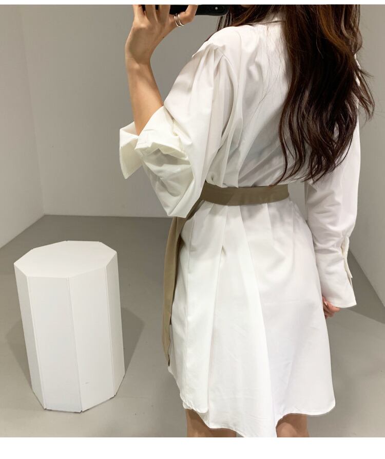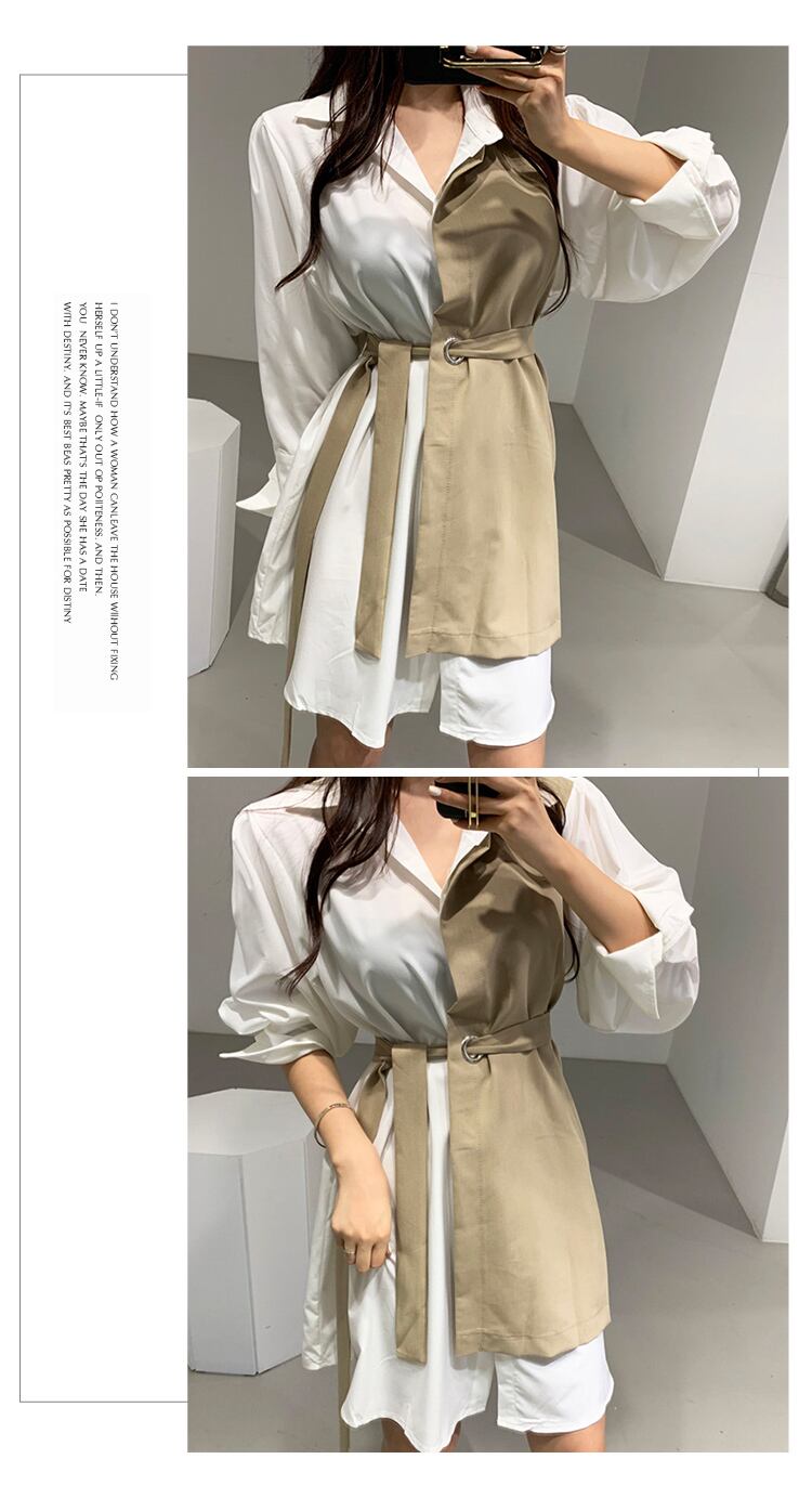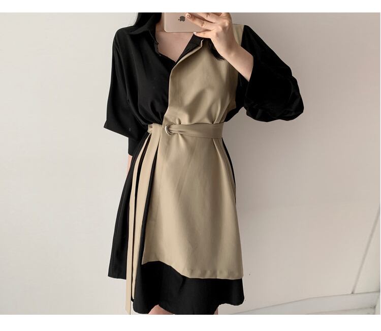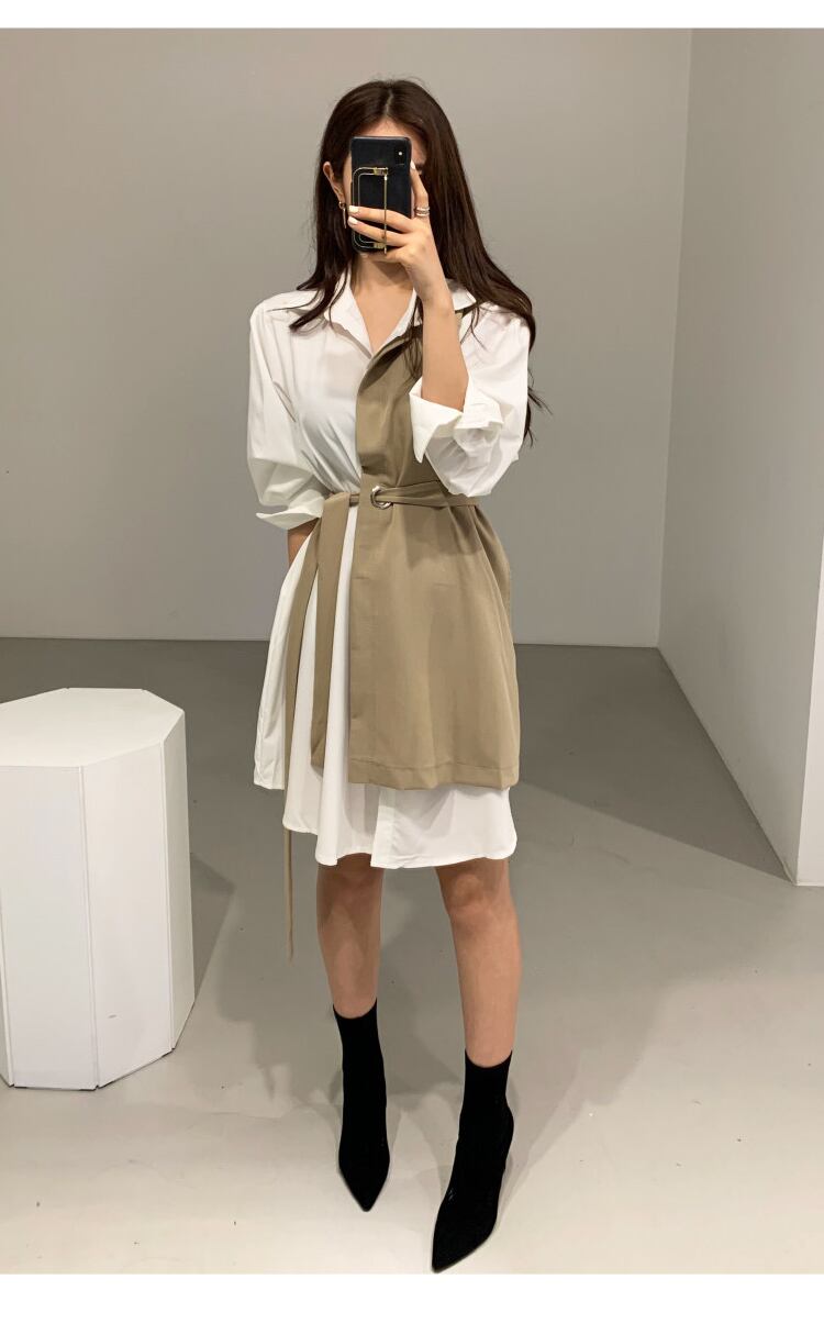 コントラストステッチフェイクツーピースレースアップウエストシャツドレスシックなドレスローブボディコン Vestidos デ