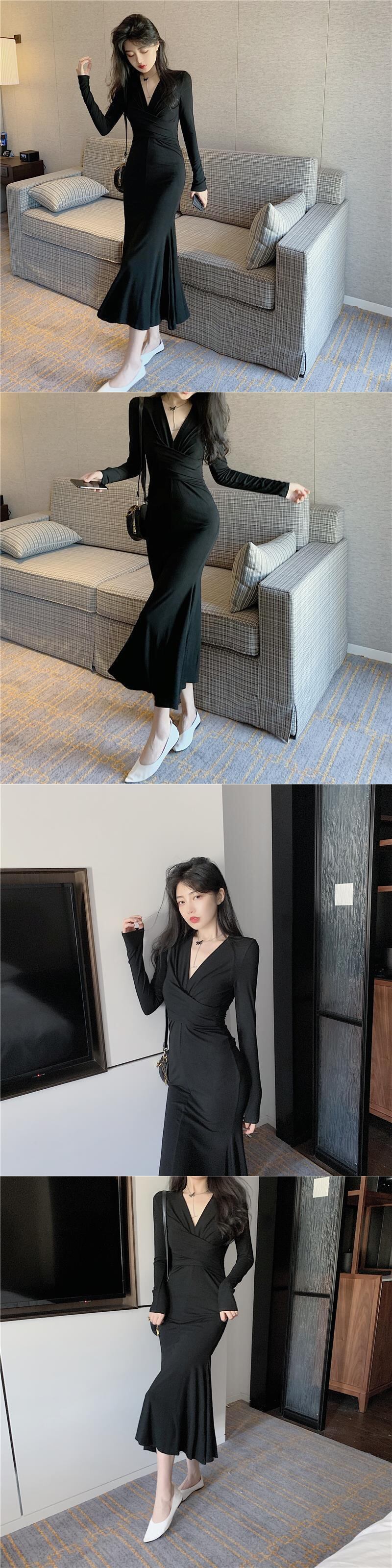春のセクシーな V ネックワンピース長袖黒マーメイドドレスラップヒップフリルスリム野生 Vestidos デ OL 綿 ロング ブラック コットン スプリング 春物 Vネック